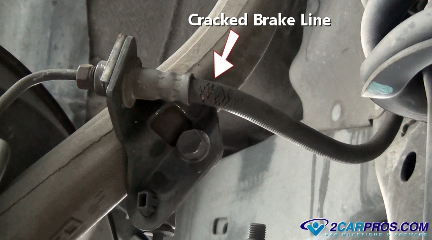 2. Again, use a flashlight and check the backside of each of the four wheels while looking for leakage, which will be obvious. Also, check the brake line flex hoses, here is what a brake line looks like before it starts leaking. If this hose is wet, fluid is leaking and the brake hose must be replaced.