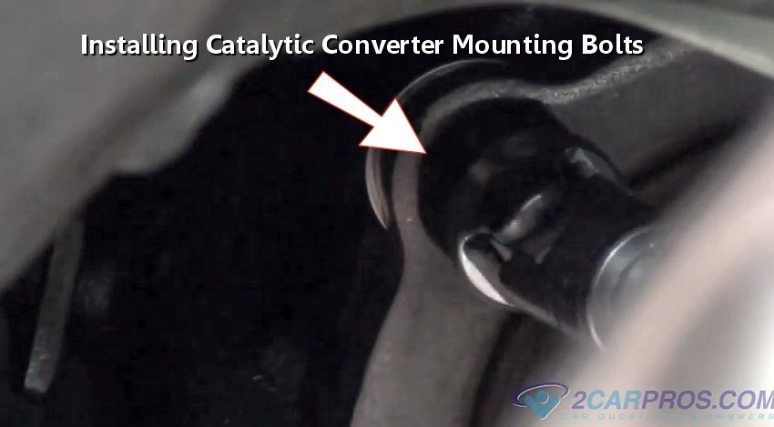 8. Hand thread in the mounting nuts or bolts and but do not tighten. Use a socket to take up the slack while still leaving them loose. The final tightening will be done after the rear of the catalytic converter outlet pipe has been reconnected. If you tighten these nuts or bolts prematurely it will cause a strain, and a possible leak as the unit will need to be forced into position to connect the rear of the unit. Look up the torque specs for your particular job for the final tighten and you are all set.