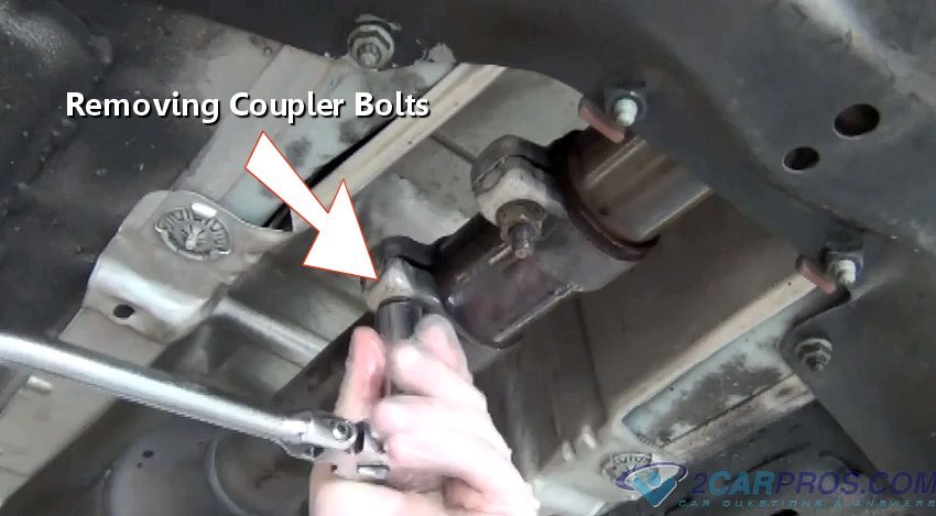 4. Continue by removing the exhaust pipe coupler mounting nuts using a 15mm or 16mm wrench or socket at the rear of the catalytic converter. Once the rear exhaust mount has been removed use a plastic or rubber hammer to separate the muffler from the catalytic converter outlet pipe. It may require some wiggling to free it from its position.