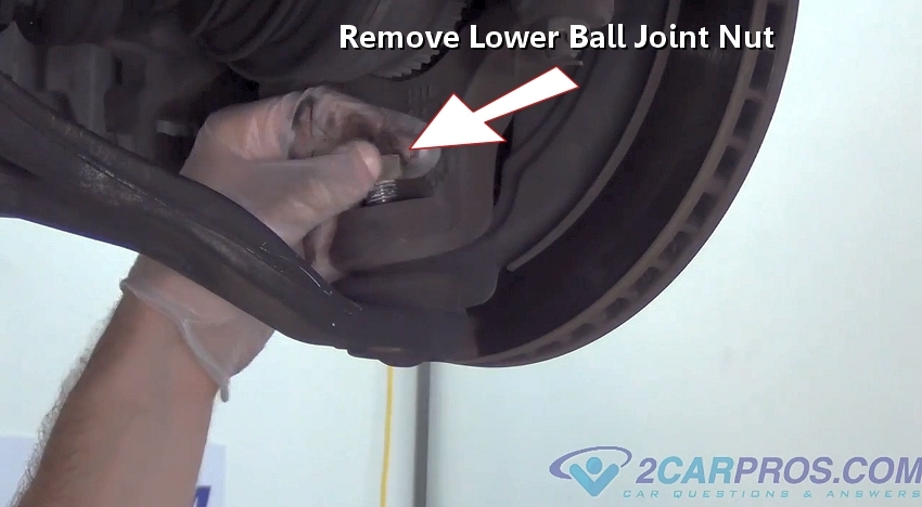 Once the ball joint has released finish removing the lower ball joint nut and continue with the repair. We will demonstrate the upward style of ball joint below.