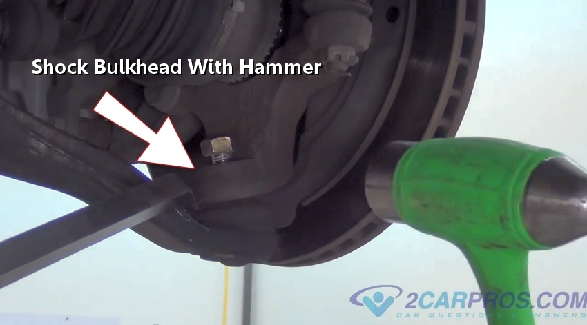 While applying force downward strike the lower control arm bulkhead to release the ball joint taper. This will take more than one hammer strike to get the ball joint to release in most cases. If you have trouble with this step have a helper apply additional pressure on the pry bar while using a larger hammer to make the strikes. This will "shock" the joint loose and you should feel a pop when the joint releases.
