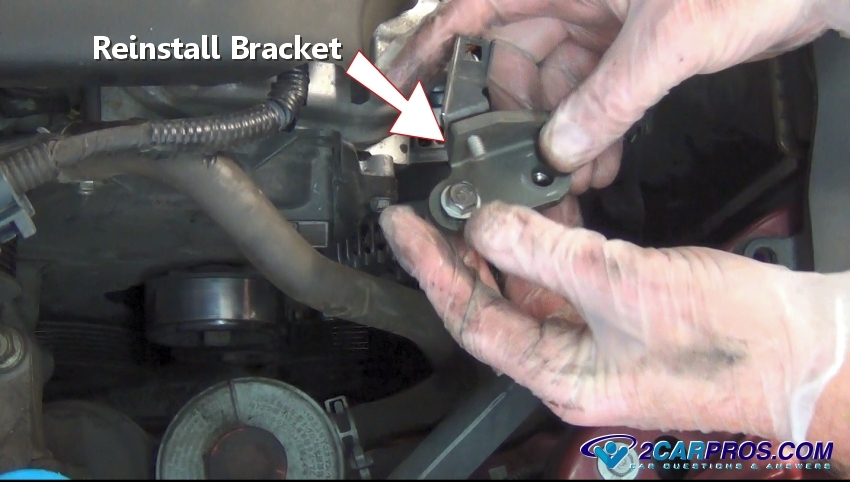 4. Once the alternator is in its lower mount, reinstall the lower mounting bolt. Leave the bolt hand tight until the installation of the upper bolt. If you tighten the lower bolt first the upper bolt might be difficult to install or it can bind which will cause the bolt to strip out.