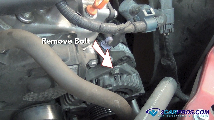 6. Locate and remove the lower alternator mounting bolt. This bolt can be tight so keep a good grip on the wrench or socket while placing the wrench or socket firmly on the head of the bolt to avoid rounding the bolt head.