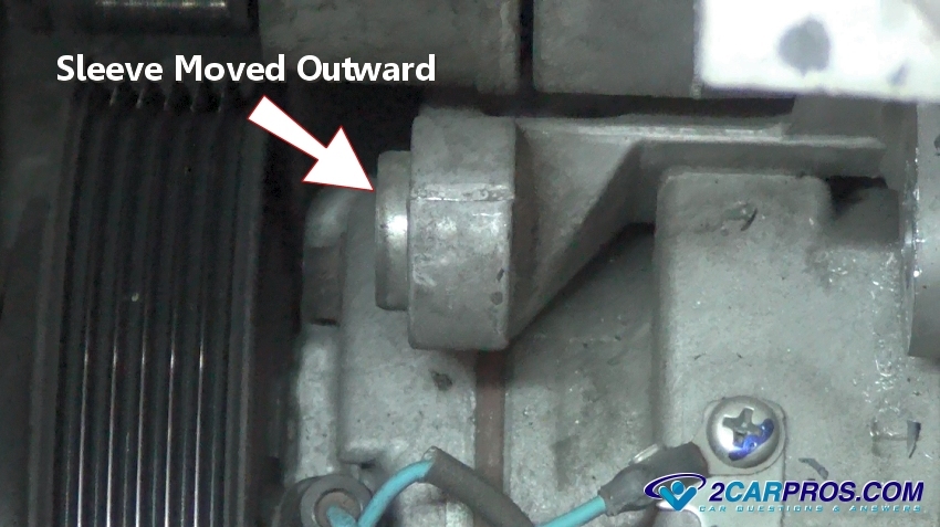 2. Use a large punch or metal bar to gently hammer the sleeve outward. This can take a little finesse, stay with it because it only needs to be moved a little bit to get new alternator installed.