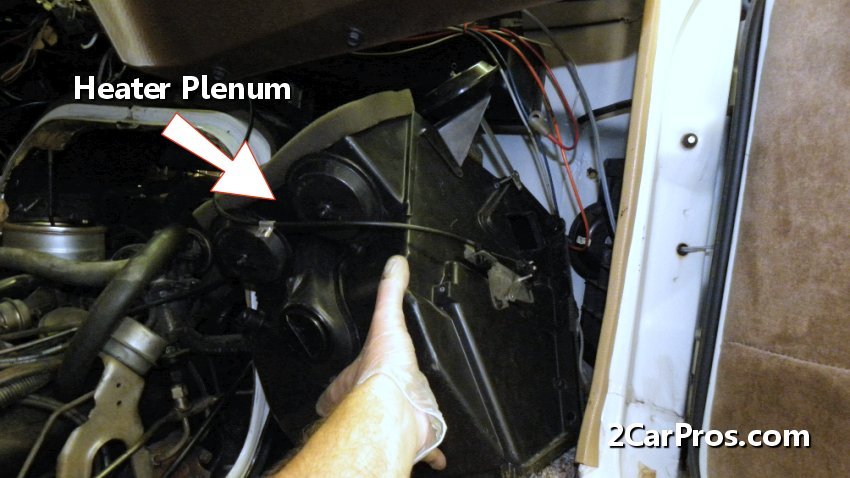 Inside the engine bay, locate the heater plenum mounting bolts and remove. This