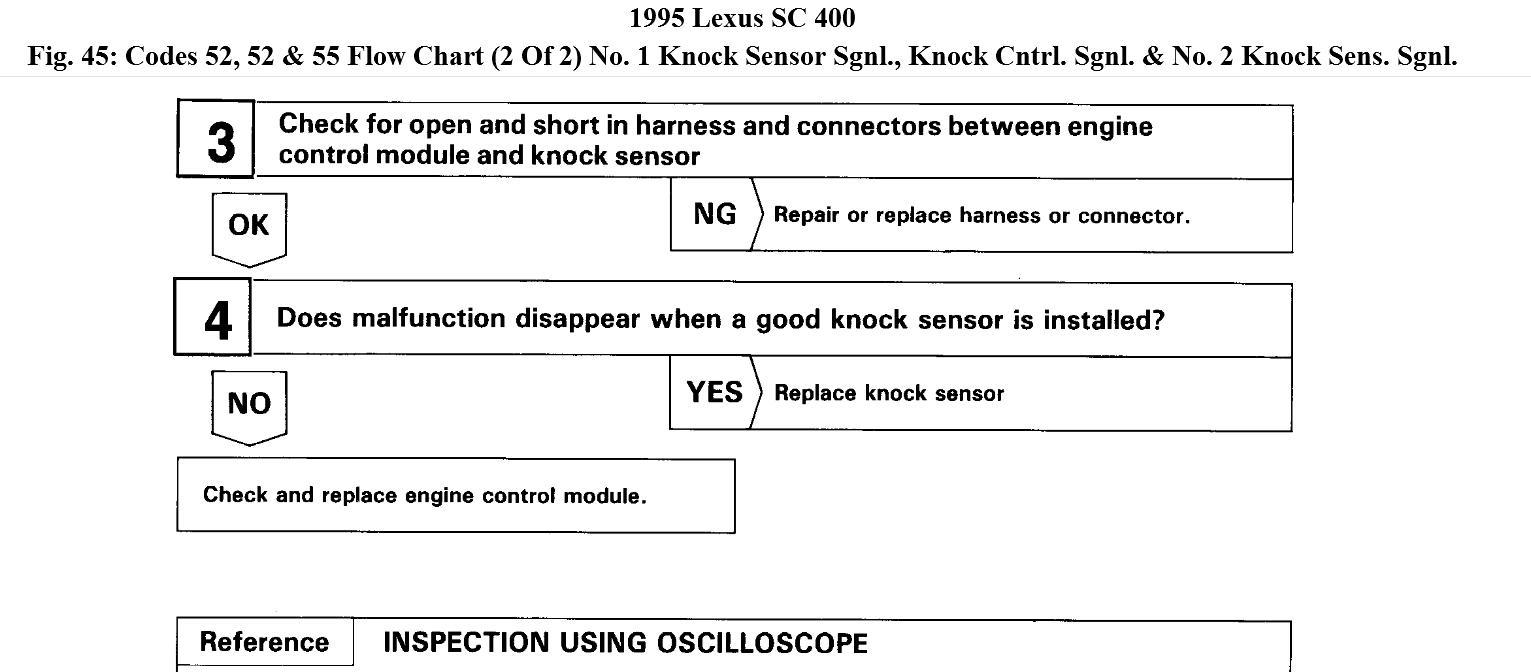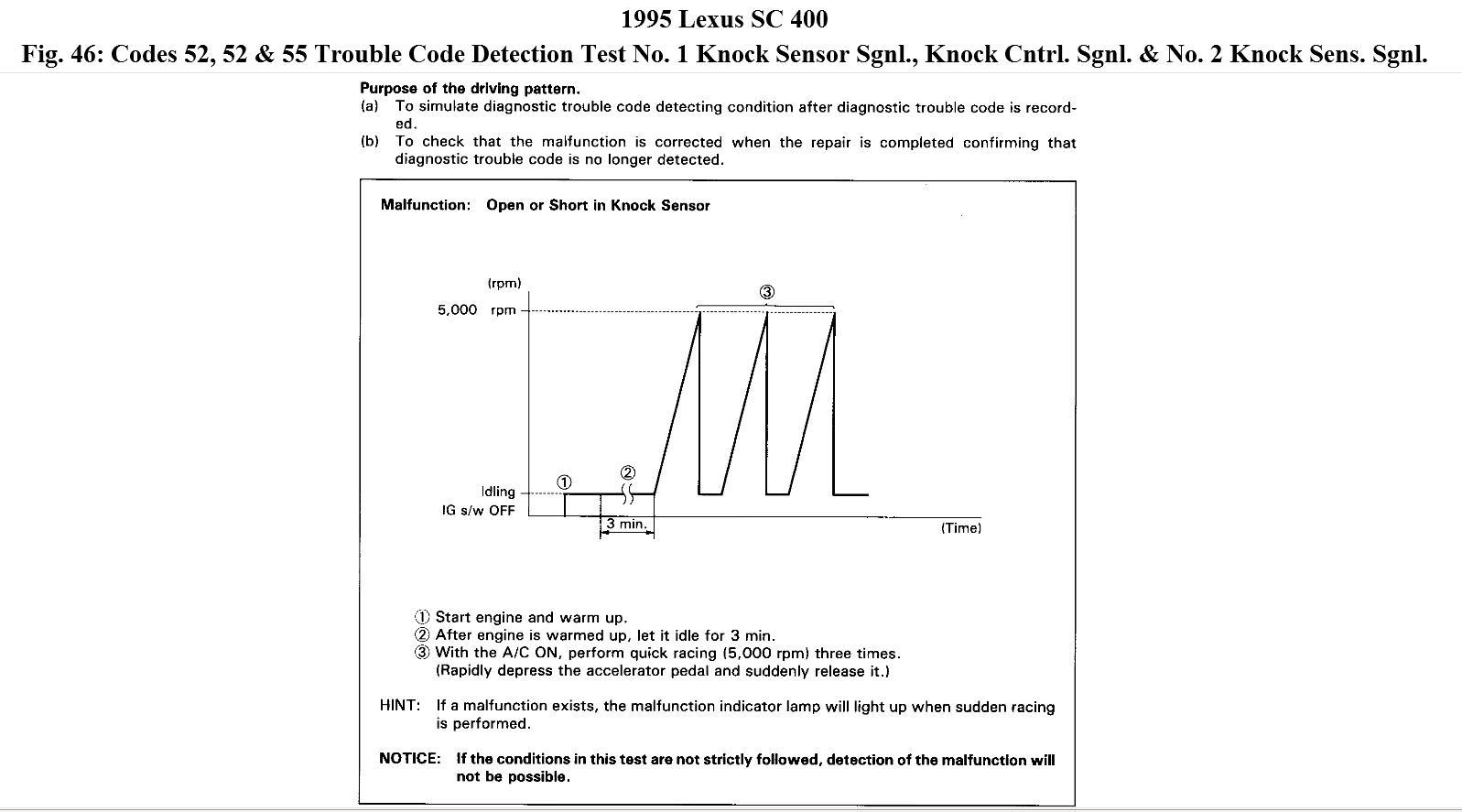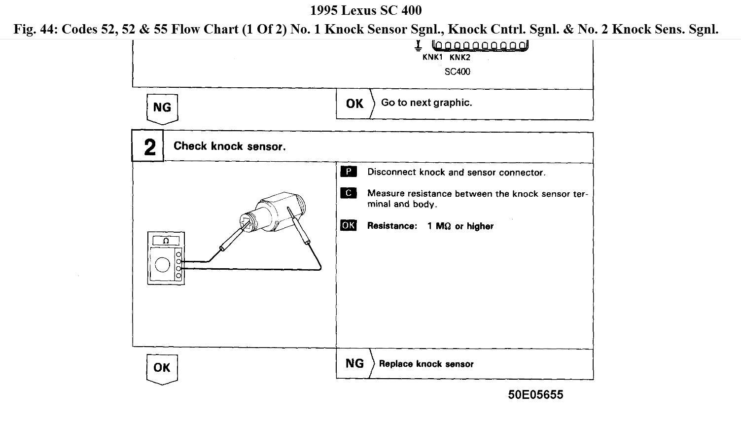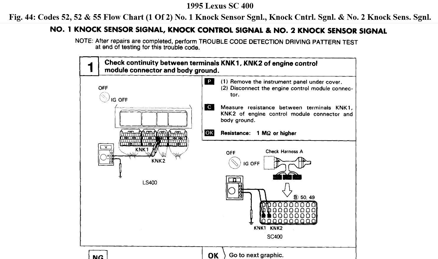 I have a 1995 sc400 with a bad hesitation, has two codes, 52 and 55 both knock sensors, The car hesitates between 1500 and 2600 rpms after 2700 it seems to run fine. The hesitation if at light throdle is so bad the drive train slaps back and forth. I have replace the MAF, TPS, check the fuel pump, ran it in high speed. None of this helps. If I pull the MAF cable off and the ECU is in limp home mode. The car RUN GRET, Also check both coils, seems fine. I have even used a analog scope to check most of the input at the computer, I see the MAF, TPS, O2 values, engine temp, cam signals, gee did I leave anything out. I even check the VF1 and VF2 learn air fuel ratio, both are around 2.1v, Can't sigure this one out, I put new cap's and rotors on last night and will change the plugs tonight to see if this help, but I see no reason why it should, when the car runs great in limp mode. ECU bad?