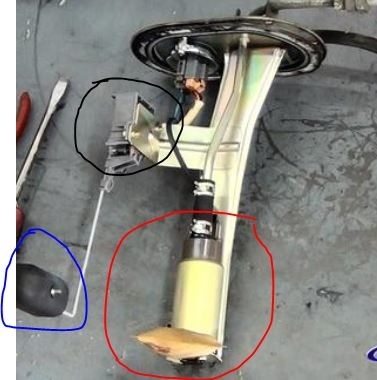 First, take a look at picture 1. I circled three things. In blue is the float that rides on the fuel level in the tank, the black circle shows what is called a rheostat. That is what determines how much power to send to the gauge. They can go bad. And in red, is a pump. Now, if they only replaced the pump and not the entire assembly, the sending unit wasn't touched which leads me to think it is stuck and not moving off 1/4 tank.