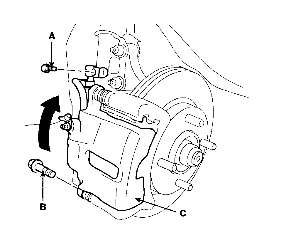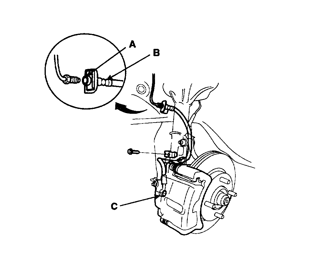 4. Remove the connector bolt (c), and disconnect the brake hose from the caliper. 5. Remove the brake hose from the knuckle.