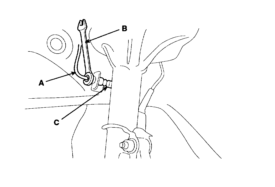 2. Disconnect the brake hose from the brake line (B) using a 10 mm flare-nut wrench (C)