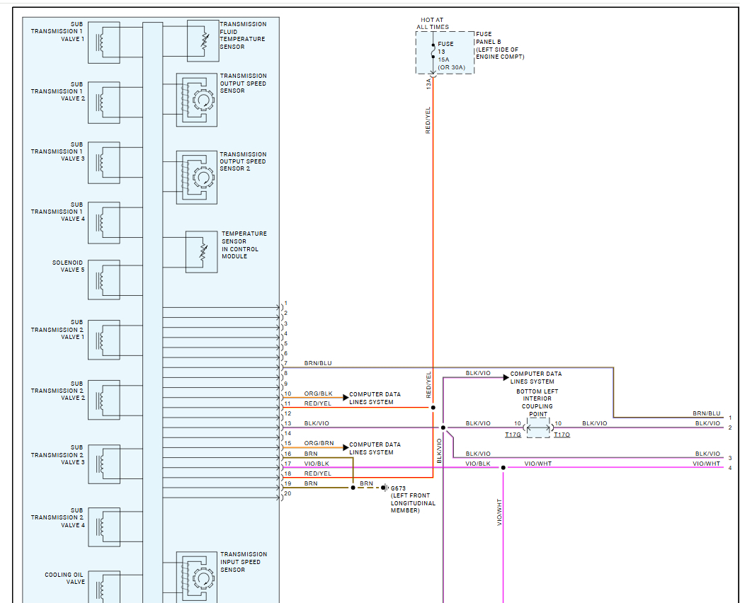 I did the repairs wires got rip out an I have put them back together it’s the factory transmission and the factory wire harness the blue wire was t added it was in the factory harness when I took the factory tape off the harness the photo you sent is way more than 14 wires that the plug has almost all of the wires are yellow with a color strip 1 red wire 1 black wire no one has added to it. The car is a turbo auto trans 6 speed auto transmission there are so many models still not sure exactly what car. It is has the big sunroof.