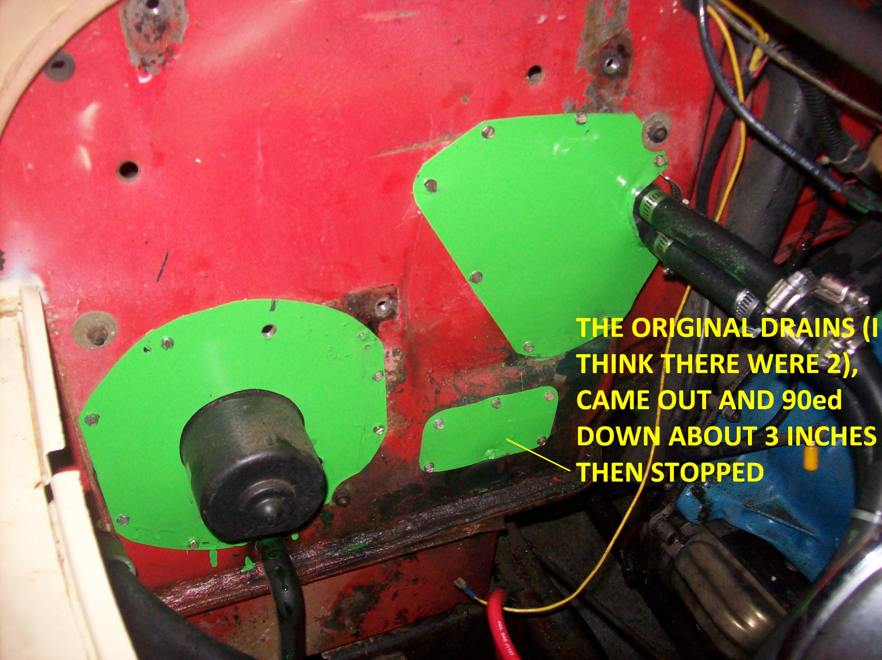 THIS IS THE DRAIN DRAIN ON MY '77 (NOW)---ACTUALLY I INSTALLED A 1982 HEATER IN MINE, THE DEFROST BLOWS 20 TIMES BETTER AND IT HAS THE FRESH AIR VENTS WHICH REALLY BLOW SOME AIR BETWEEN THE DRIVER'S LEGS AND ON THE PASSENGER SIDE