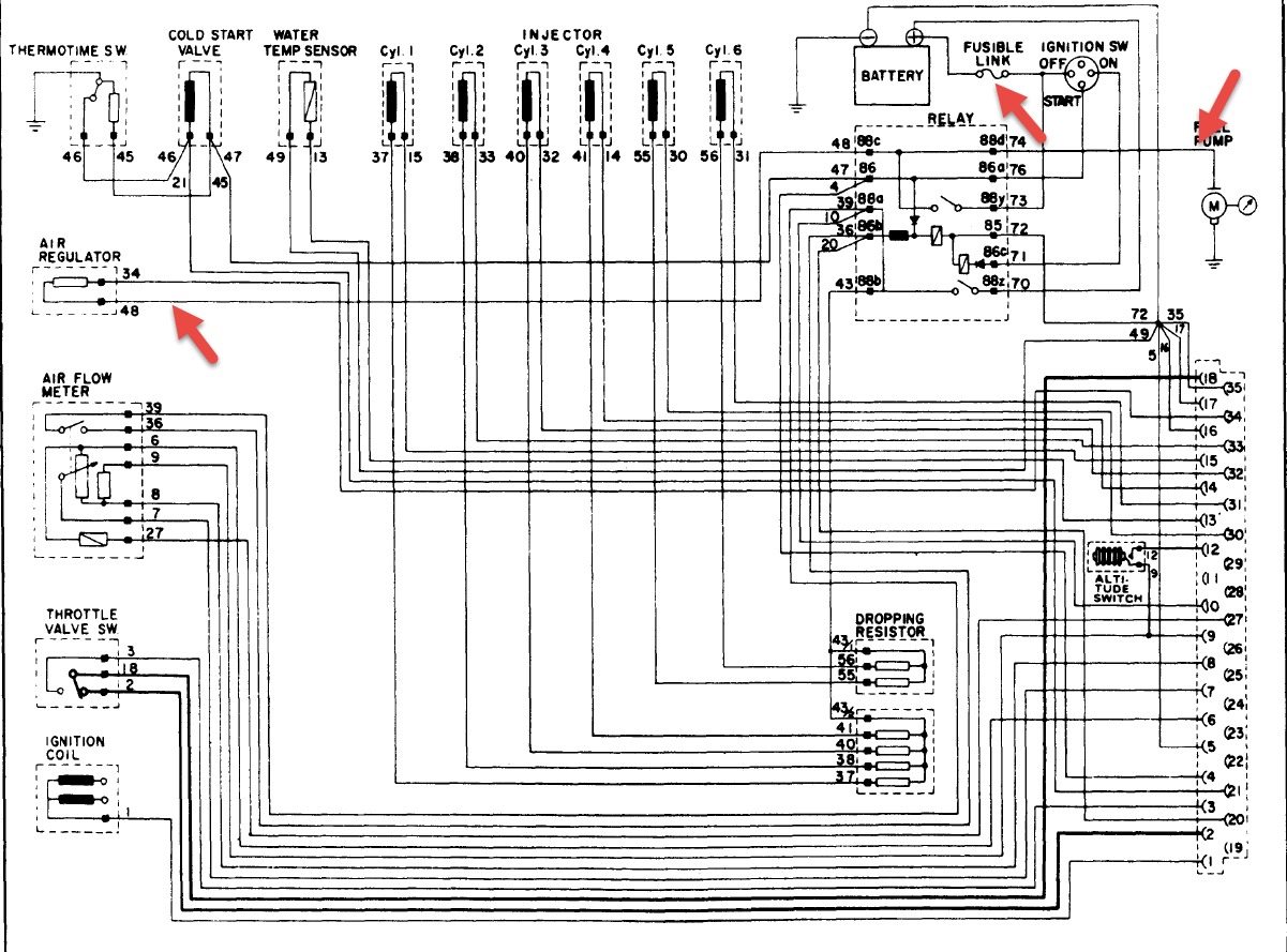 I have a 1977 280z base inline 6 engine. I've been trying to turn it on but it seems like no fuel is getting into the fuel injections. What can I do to solve this problem.I have changed the old fuel pump which I found out was still good, I checked the relay and it seems to be clicking when I try and turn on the car, I put starter fluid into the injection and it turns on but it doesn't stay on because it doesnt get any more gas