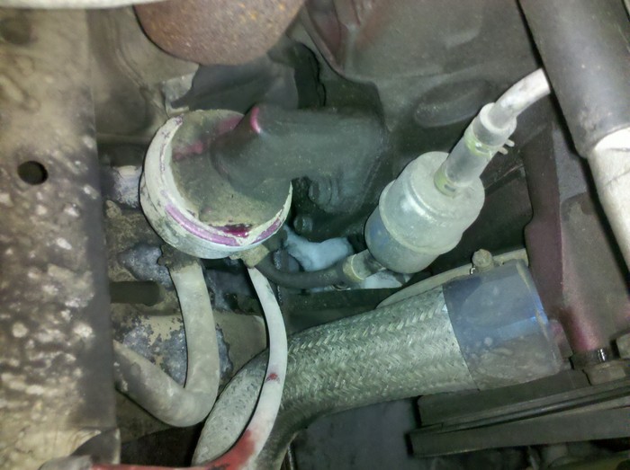 I have a 1980 GMC sierra 1500 with a 350. I dont know much about trucks or cars. But I was driving in snow on a dirt road and hit a deep rut dug from people mudding and later on I started hearing a click noise from the front pasenger side and looked under the hood to find gas shooting out of some round thing. What could be wrong?