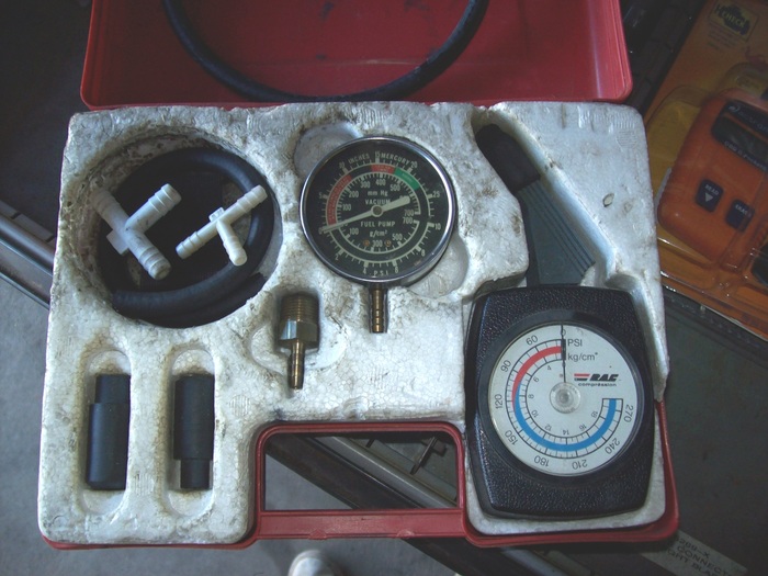 4) VACUUM GAGE/FUEL PRESSURE GAUGE (SAME GAUGE)/ COMPRESSION GAUGE KIT (ALSO OLD AS THE HILLS) THIS IS A REALLY HELPFUL SET, ESPECIALLY THE VACUUM GAUGE --- I PRETTY MUCH STARTED OUT WITH NOTHING.....AND I STILL HAVE MOST OF IT LEFT!