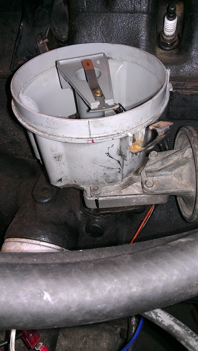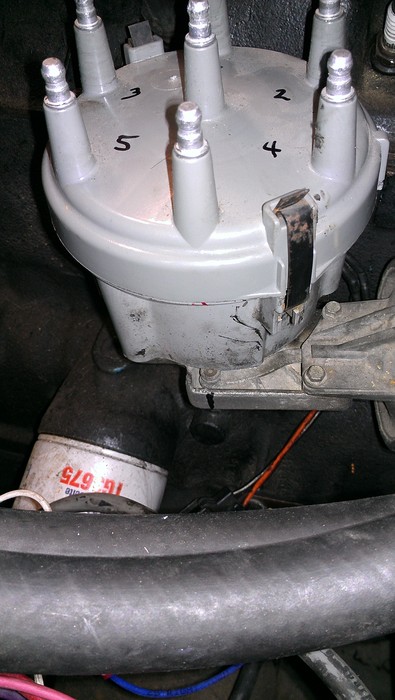 NOW THEN---TAKE A MARKER AND MARK THE DISTRIBUTOR BODY BELOW THE PLASTIC DISTRIBUTOR CAP---WITH A VERTICAL LINE---SEE PIC 2