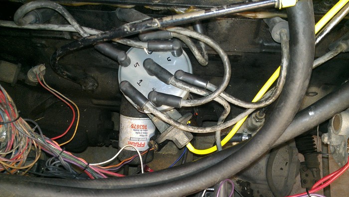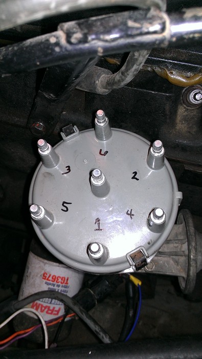 SO LOOK AT #1 WIRE ON MINE, IT'S JUST ABOVE THE END OF THE VACUUM ADVANCE ARM THAT YOU CAN SEE AT THE BOTTOM OF THE DISTRIBUTOR----1-5-3-6-2-4 CLOCKWISE----INSURE THEY CORRESPOND WITH THE SPARK PLUGS...."1" IS AT THE FRONT OF THE ENGINE---"6" IS AT THE BACK!