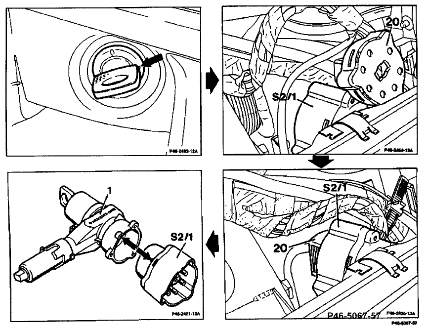4. Screw ignition/starter switch (S2/1 ) out of steering wheel lock (1 ), screw in, pull out, insert. Insert ignition/starter switch (S2/1 ) so that locating lug (arrow) engages in recess in steering wheel lock (1 ).