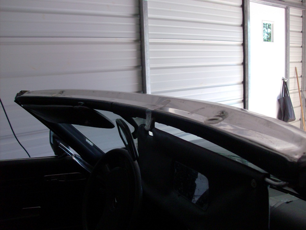 This is the convertible coupe. What is the body part into which the convertible top sets on the windshield? (The chrome piece)and what is the body part on which that chrome piece rests (has the interior lights in it)
