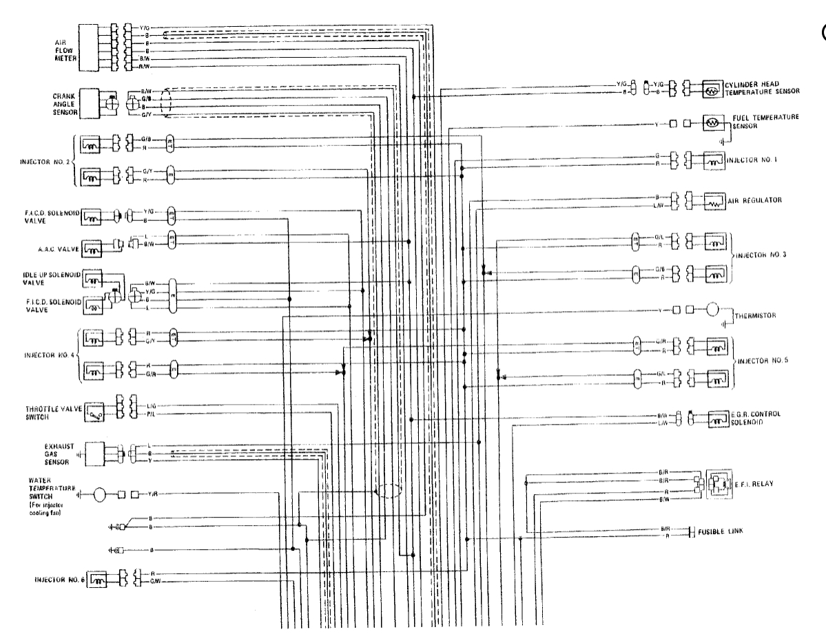Ignition on, ECM would not boot even with power on the proper pin at the ECM, unless a momentary ground of the #6 red wire at the ECM, from the EFI relay. Once powered up, turned screw to get codes, got 2 relating to the A/C. However, when ignition switch off, the ECM stays powered up (checked for 15 minutes) until ECM physically unhooked from harnesses. I have contacted the local Nissan dealer, and they disavow any knowledge and desire to tackle this, so in my shop it still sits.