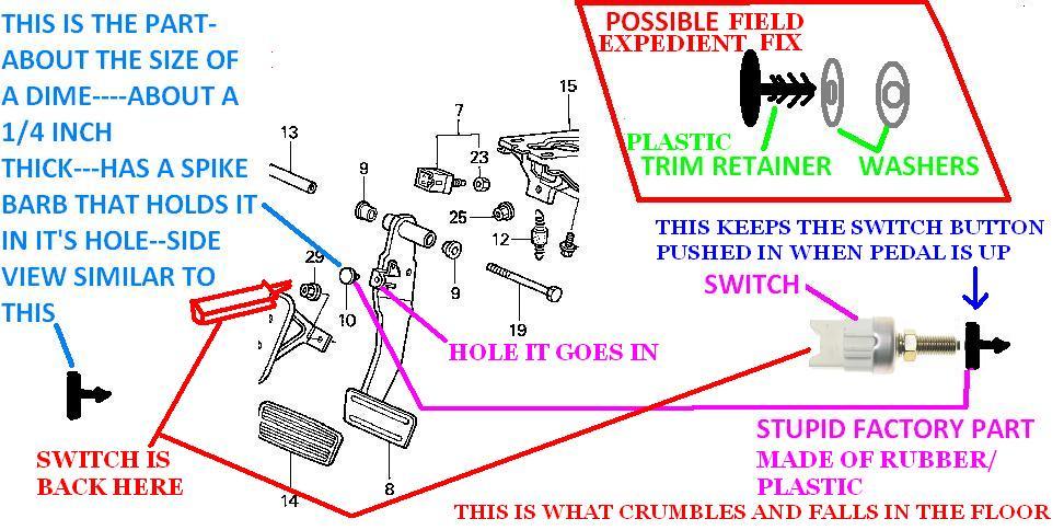 I DON'T REMEMBER WHOSE CAR I HELPED ON THE 1ST TIME I ENCOUNTERED THIS "STUPID PART"---WE WERE UNABLE TO FIND IT AT SEVERAL PARTS STORES (MUST BE A DEALER ITEM) SO WE USED A PLASTIC TRIM DEALEE (LIKE HOLDS THE DOOR PANEL OR CARPET IN YOUR TRUNK---WE STACKED A FEW WASHERS UNDER IT AND. WAH-LAH! IT PUSHED INTO THE HOLE AND WAS NOW TALL ENOUGH TO DEPRESS THE SWITCH