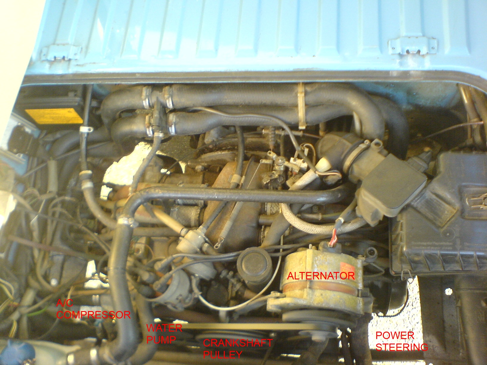 It looks like an alternator and has a belt connected to it. In my van it is leaking some kind of black stuff that dried and is hard. When I try to crank my engine it makes this loud, whining sound. The van won't start, but it turns over just fine.