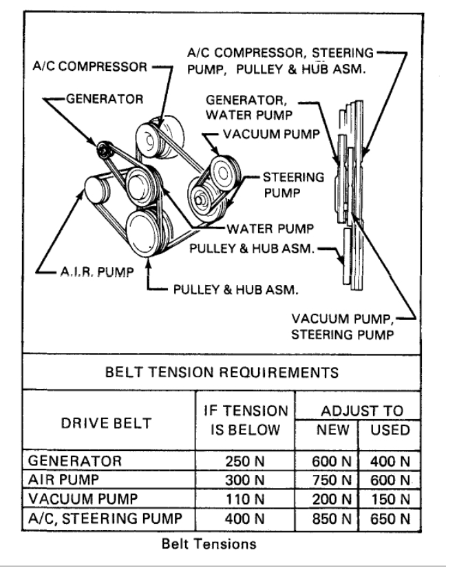 Check drive belt for cracks, fraying, wear and proper tension. Adjust or replace belts as necessary. Using a suitable belt tension gauge, adjust belt according to the following specifications: 5/16 inch-80 lbs. Max. (New), 50 lbs. Min. (Used); 3/8 inch-140 lbs. Max. (New), 70 lbs. Min. (Used); 15/32 inch-165 lbs. Max. (New), 90 lbs. Min. (Used).