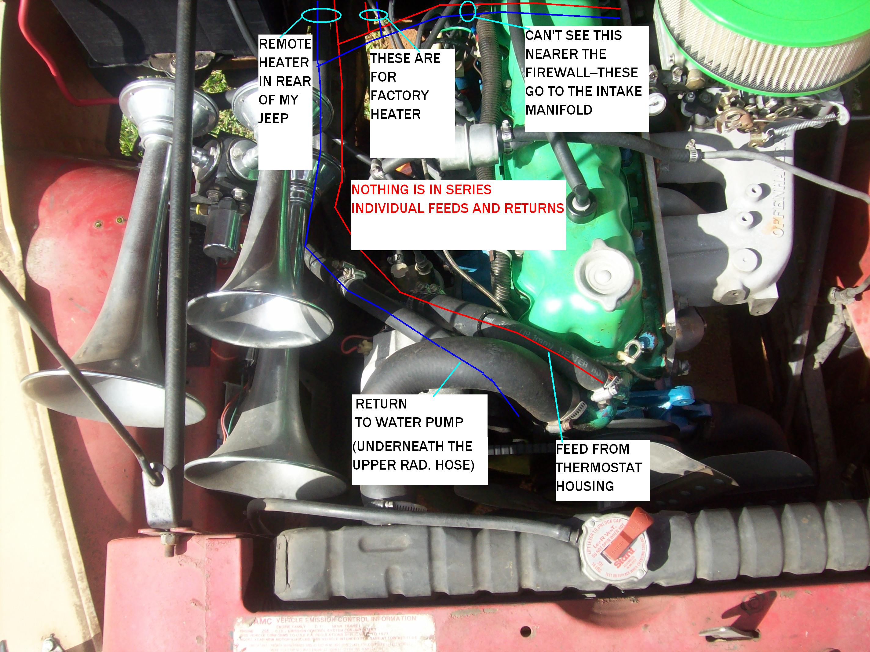 I HAVE A '77 CJ 5---I HAVE MANY MODIFICATIONS ON THE HEATER LINES, I LEARNED I MUST INSTALL "FIXTURES" AS IF IT WERE A "STEAM" SYSTEM."FEED AND RETURN". THINGS DO NOT WORK IN A SERIES