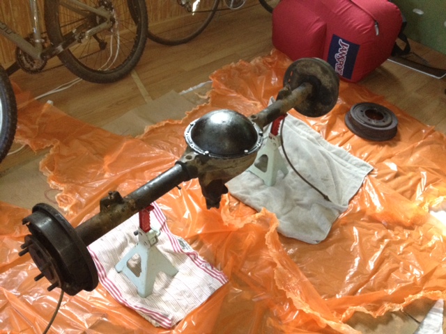 REAR ON JACK STANDS---WHEELS OFF----BRAKE DRUMS OFF---DRIVESHAFT OFF AT DIFF END.I'M GETTING RID OFF AS MUCH FRICTION/ WEIGHT AS POSSIBLE