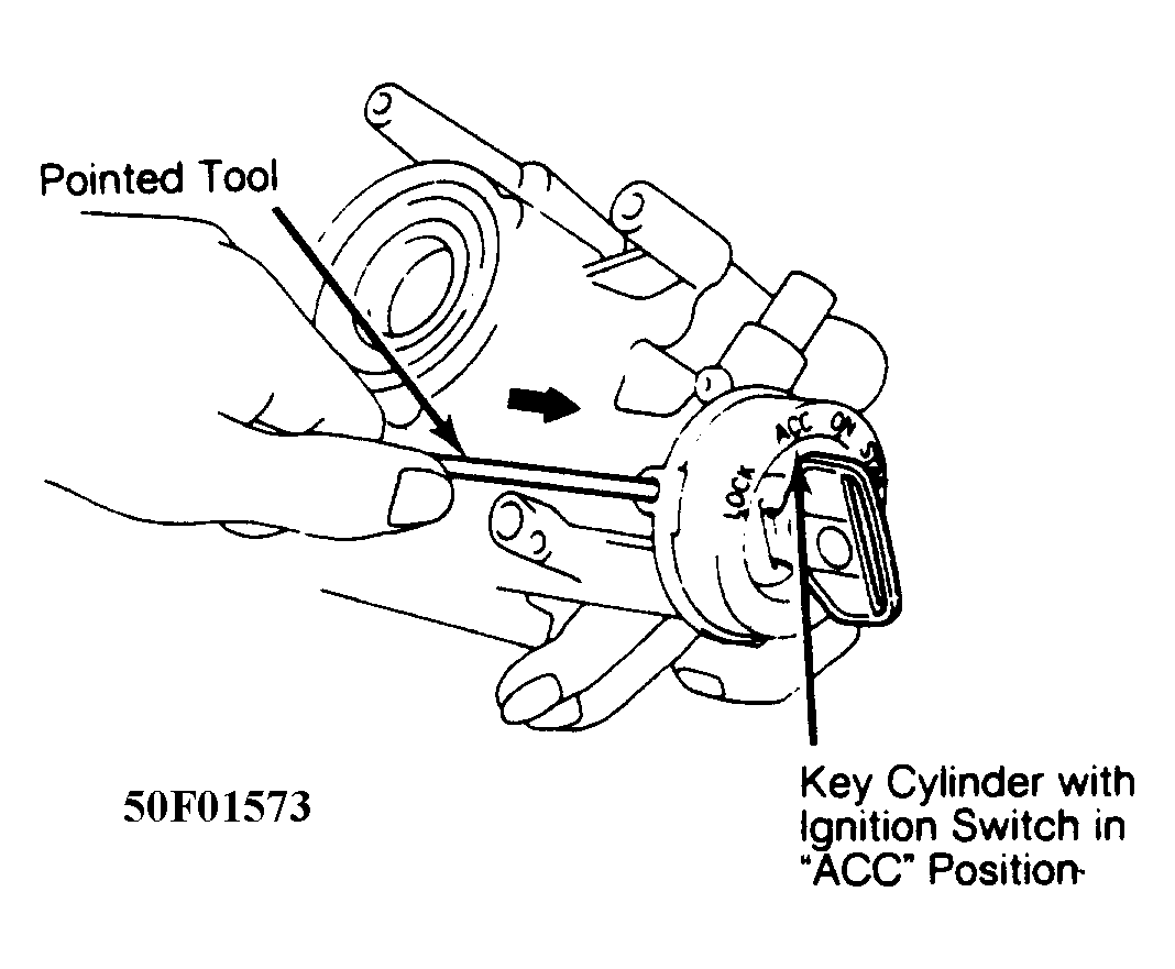 Insert key and turn ignition to "ACC" position. Using pointed tool to press down stop pin on side of cylinder, free mechanism and pull cylinder from housing.