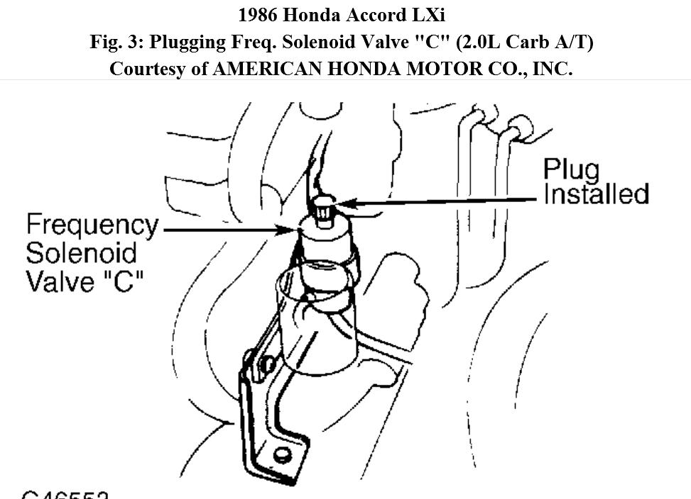 1. Start and warm engine to normal operating temperature. On 2.0L engine with automatic transaxle, remove air filter from frequency solenoid valve "C" and plug the opening. See Fig. 3. With engine idling under no load condition, lower idle speed as much as possible by turning throttle stop screw.