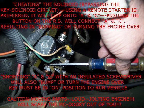 A Jumper wire momentarily touched or a Screwdriver touching POS BATTERY or POS BATTERY CABLE to the "S" terminal will by-pass the wire from the key