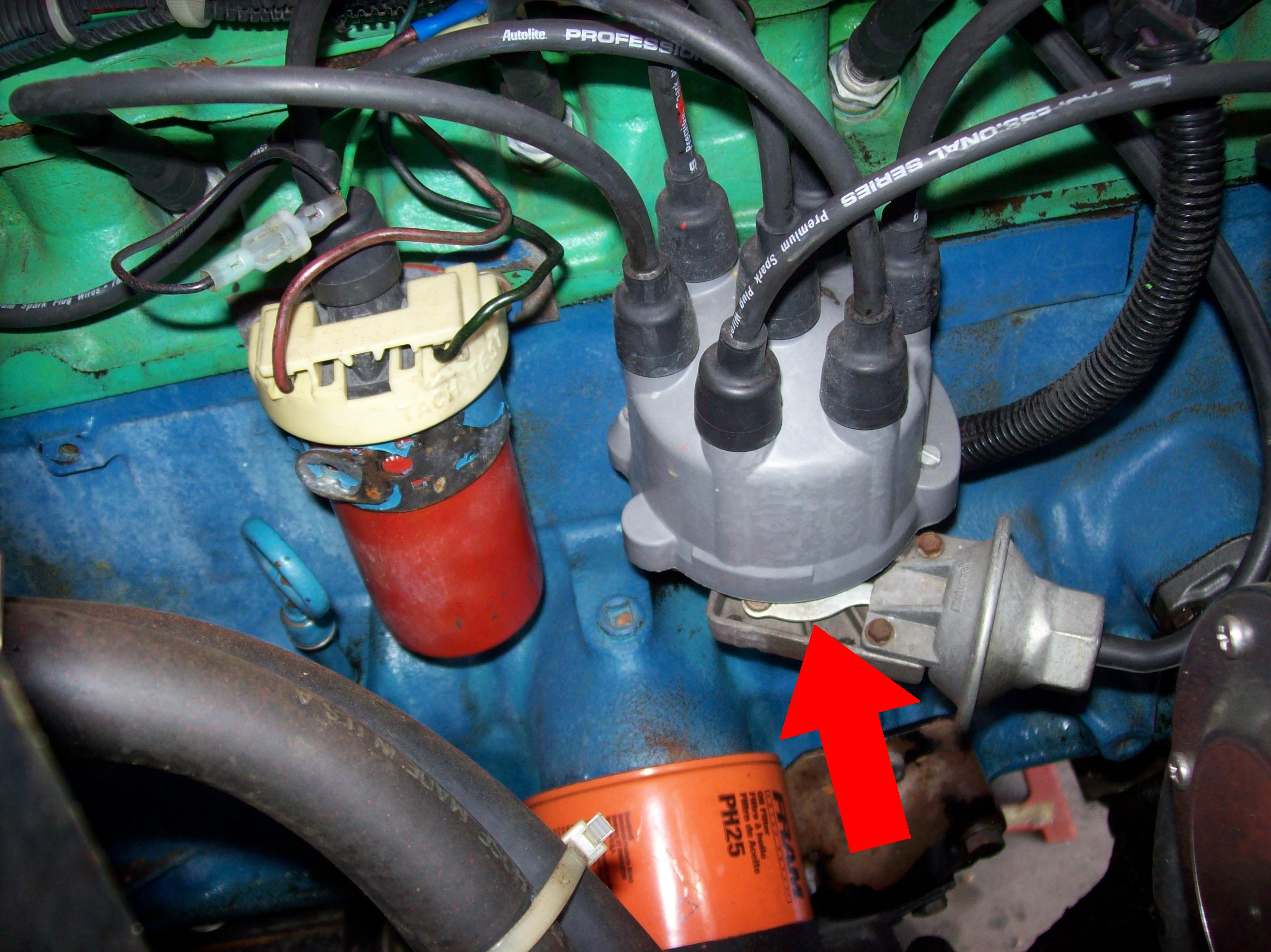 IS THE ARM IN PIC 4 (RED ARROW) IS MOVING, WHEN THROTTLED, MOST LIKELY VACUUM ADVANCE IS WORKING RIGHT. WITHOUT USING A TIMING LIGHT. IF IT DOES NOT MOVE, THE DIAPHRAGM THAT MOVES THE ARM MAY BE BAD, OR DEBRIS, ETC, WILL NOT ALLOW IT TO MOVE