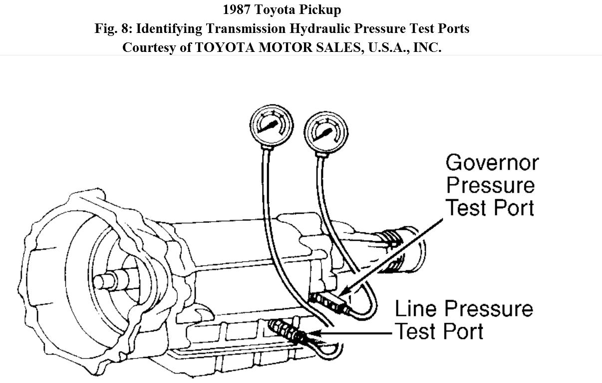 Gauge (09992-00094) to line pressure test port on transmission. See Fig. 8.