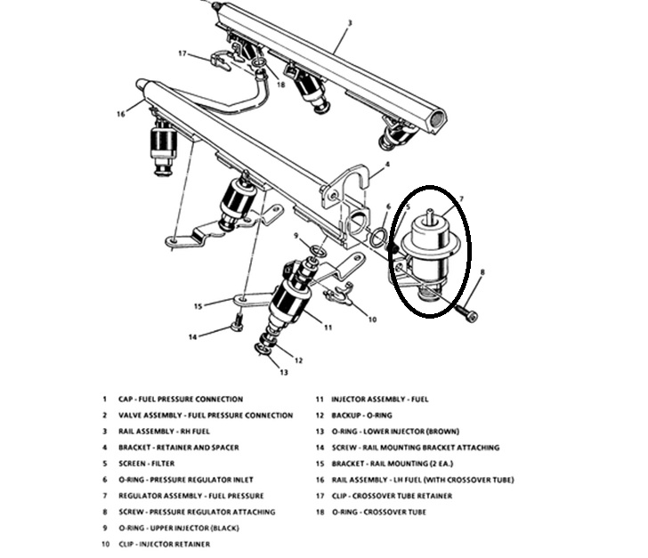 Check the fuel pressure regulator attached to fuel rail, has a vacuum line attached to it. Any gas in the vacuum line, replace regulator. Don't take anything fuel related loose without being sure there is no pressure on the system. The circle in the picture is the regulator.