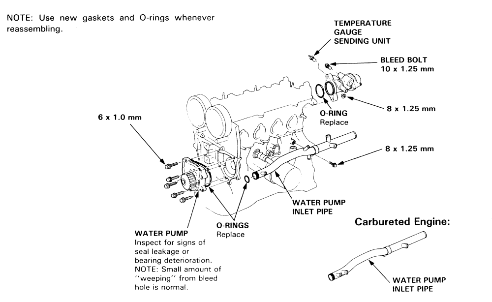 Replace the O-ring and install the water pump. Make certain the O-ring does not deform or come out of place. Tighten the mounting bolts to 9 ft. Lbs. (12 Nm). On the Accord V-6, tighten the 8mm bolts to 16 ft. Lbs. (22 Nm) and the 6mm bolts to 9 ft. Lbs. (12 Nm).