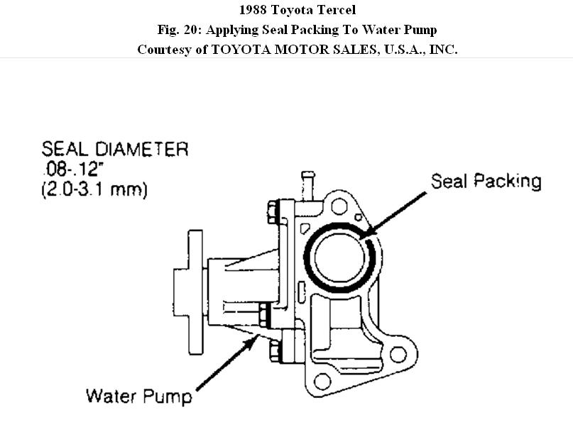 Apply seal packing to water pump. See Fig. 20. Install new "O" ring to inlet pipe. Apply a water and soap solution to "O" ring. Insert inlet pipe in water pump. Install water pump and tighten to specifications. To complete installation, reverse removal procedure.