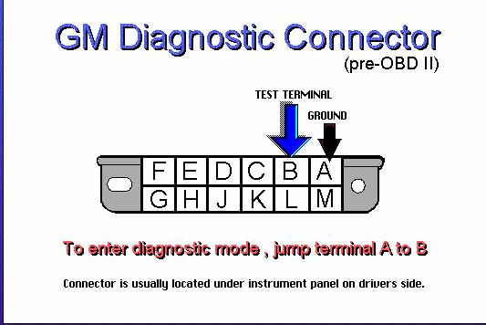 Cross terminals A & B as shown with a piece of wire, PROCEDURES FOR READING GM FLASH CODES 1. Turn the ignition switch ON but do not start the engine. 2. The "CHECK ENGINE" light come on indicating the bulb is working. If the light fails to come on, the bulb may be burned out or there may be a problem in the Check Engine light circuit. 3. Locate the diagnostic connector for the computer. It is usually located under the instrument panel near the steering column. Insert a jumper between the "TEST" and "GROUND" terminals. CAUTION: Refer to a shop manual for the proper terminal locations. Jumping the wrong terminals may cause damage to the computer system! 4. The Check Engine should now flash. The first code should be a code 12 (Flash, Pause, Flash Flash). Code 12 will repeat two times. If any other trouble codes are in the computer's memory, they will be displayed in numerical order starting with the lowest number, and repeat three times. The codes will continue to repeat as long as the test terminal remains grounded. NOTE: BE SURE TO WRITE DOWN ANY CODES THAT ARE PRESENT NOTE: GM may use the same code number for different faults on different models of vehicles. That's why some code numbers list more than one possible cause. 5. To exit diagnostic mode, turn ignition switch off and remove the jumper. HOW TO CLEAR TROUBLE CODES Trouble codes on most older vehicles can be cleared by removing battery voltage from the computer for at least 10 seconds. Make sure the ignition switch is OFF, then remove the computer fuse from the fuse panel. Disconnecting the battery will also work, but doing so will also cause the loss of stored information and presets in other electronic accessories such as the radio, climate control system, memory seats, etc. Disconnecting the battery can also cause the computer to forget long term fuel calibration adjustments, and may affect the operation of an electronic transmission until the computer can "relearn" the shift points. The preferred method of clearing trouble codes is to use a scan tool. Page 1