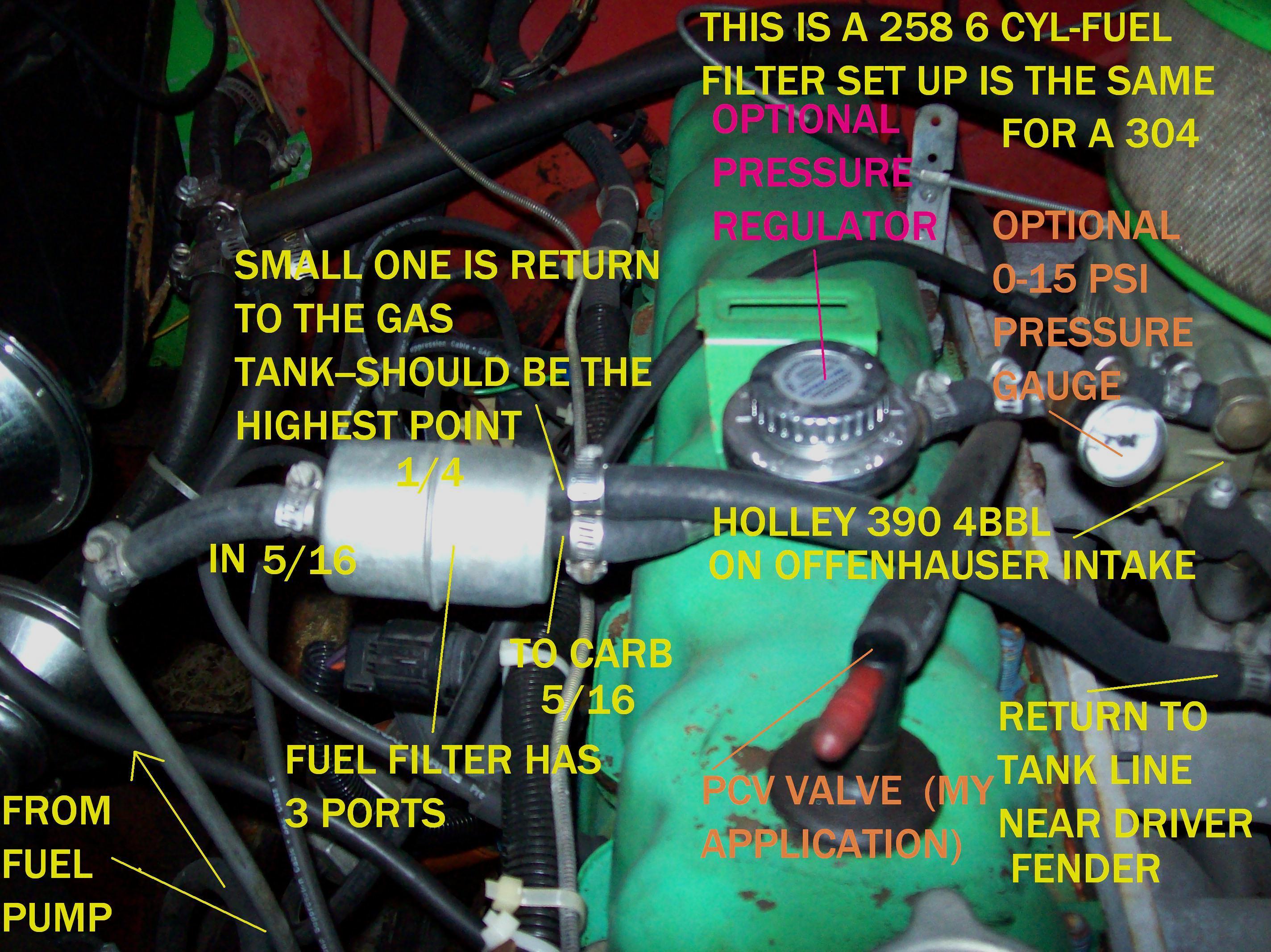MORE THAN 1/2 OF THE CRAP ON YOU ENGINE, PROBABLY DOES NOT WORK, AND IS USELESS, IT TAKES ONLY A FEW VACUUM LINES TO MAKE IT RUN FINE----YOUR STOCK CARB COULD BE REPLACED WITH A CARTER BBD USED ON A 1979 CJ, AND FOR 1/2 THE COST----THEY ARE ALMOST THE SAME EXCEPT FOR THE STEPPER MOTOR ON THE REAR