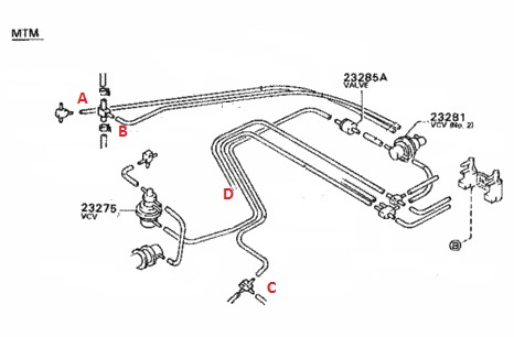 I have a Japanese made Toyota Corona GX 1989 MTM with 5AF engine. Please help me to fix my vaccum hoses for Air Conditioning. Previously, Some one has removed and messed up with the hoses and now i'm having problems when car is ideling with AC on. I've got some diagrams of the vaccum hoses from the net for AC unit, but i'm not sure with some hoses which goes into the Carb.