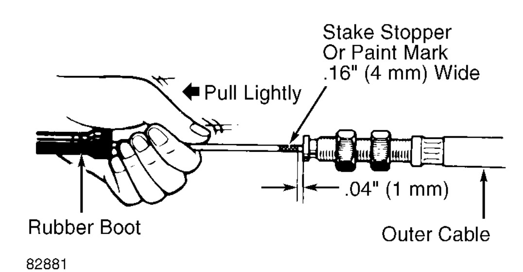 New throttle cables will not have a stopper or paint mark in place. With the new cable securely installed in transmission, pull inner cable slightly until resistance is felt. See Fig. 5. Stake new stopper or paint a mark as shown.