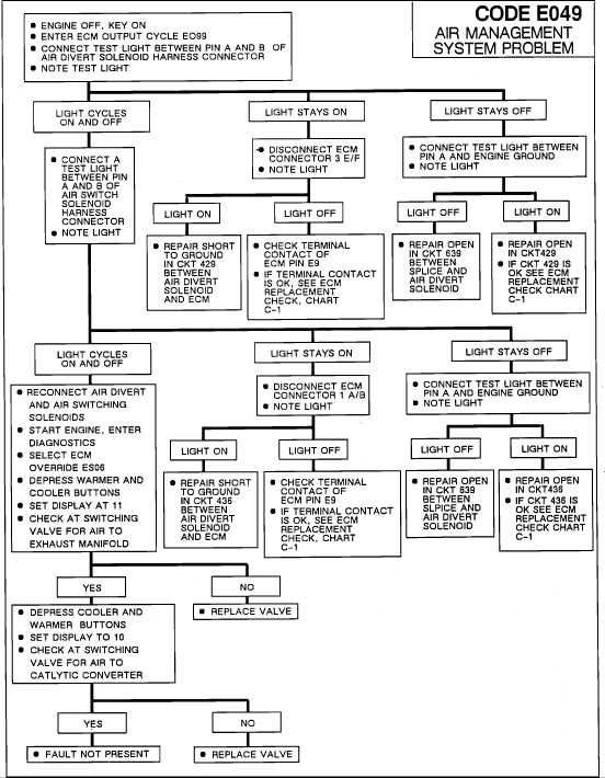 If code E049 is stored as a history code, verify oxygen sensor operation using Chart A-7. Check the operation of the AIR system using Chart C-7. Check all connectors, hoses and pipes for proper connection, corrosion, or damage.