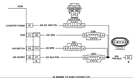 This diagnostic test monitors the AIR system to detect operating problems with the Electric Divert Valve (EDV) and Electric Switching Valve (ESV). It performs these tests using the oxygen sensor and ECM integrator function to monitor valve function. This switch valve has a 2 pin connector and is located behind the cruise control servo bracket. The divert valve also has a 2 pin connector and is atop the AIR switch assembly.