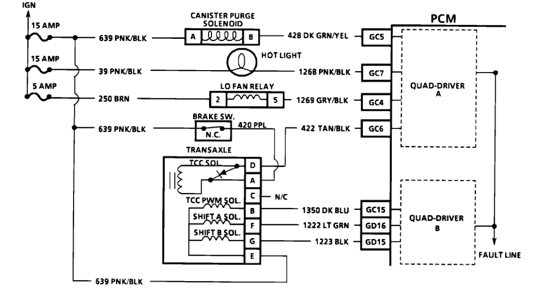 The PCM is used to control several components such as those in the wiring diagram above. The PCM controls these devices through the use of a quad-driver module (QDM). When the PCM is commanding a component "ON, " the voltage potential of the output circuit will be "low" (near 0 volts). When the PCM is commanding the output circuit to a component "OFF, " the voltage potential of the circuit will be "high." (Near battery voltage.)