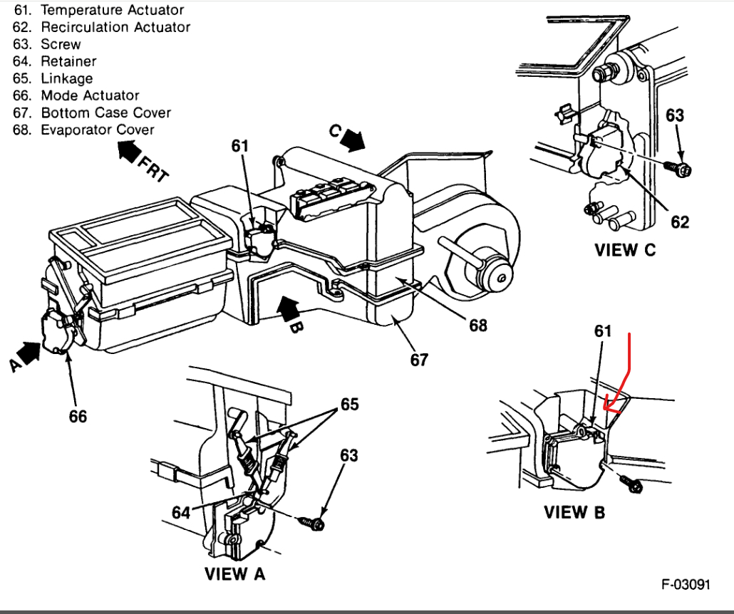 The fan blows / the doors change from defrost to dash vents to floor but when I try to change the temp setting hotter or colder it starts flashing arrows all the way across the temp setting and stays until I shut the power off when I turn it back on everything looks normal
