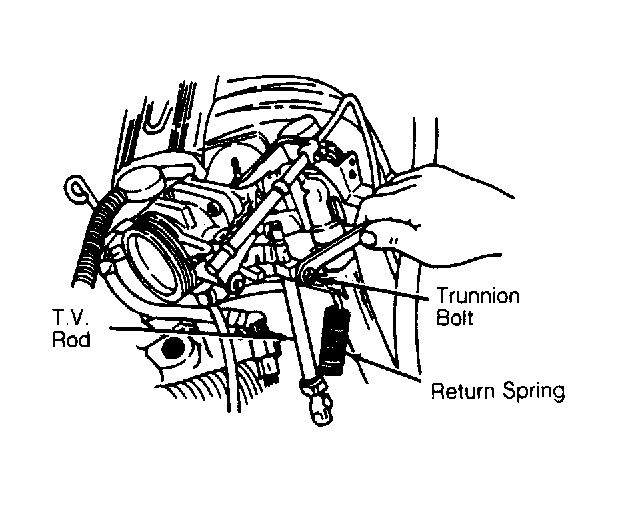 Ensure T.V. Return spring is connected between T.V. Rod and retaining bracket to hold T.V. Lever in idle position. Throttle lever should be resting on throttle return control screw. Tighten trunnion bolt. Remove plastic clip using T.V. Linkage Adjustment Tool (T91P-7000-A). Install splash shield and check for proper operation.