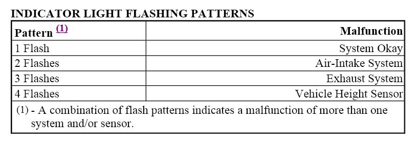 See INDICATOR LIGHT FLASHING PATTERNS. Each flash pattern is separated by a 2-second pause. Note indicator light flash patterns and check appropriate system and/or sensor malfunction.