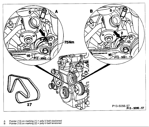 Fit poly-V-belt on beginning at tensioning pulley (1). Refer to routing diagrams. See: Diagrams