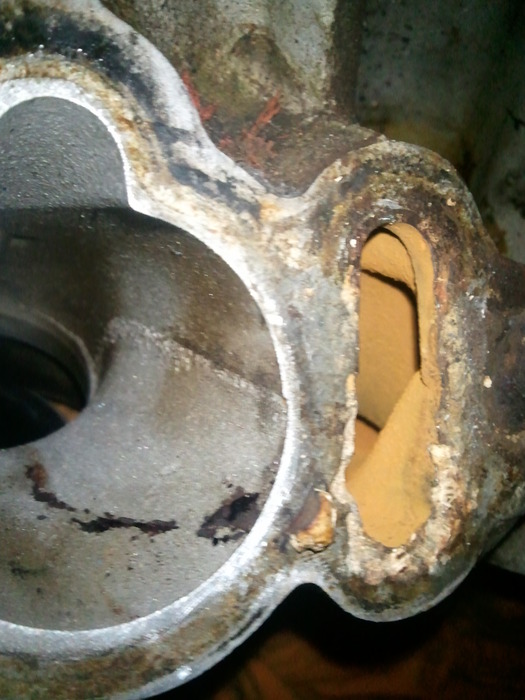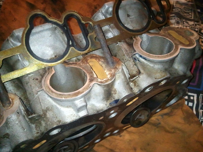 im cleaning up the mating surfaces for the gasket that goes between the intake side of the heads and the intake manifold, the intake manifold flows coolent from it into the the head and thats when I found heavy build up and what apperd to be a small crack in the water jacket inlet which turned out to be cavataition, right where the mating surface is for the gasket