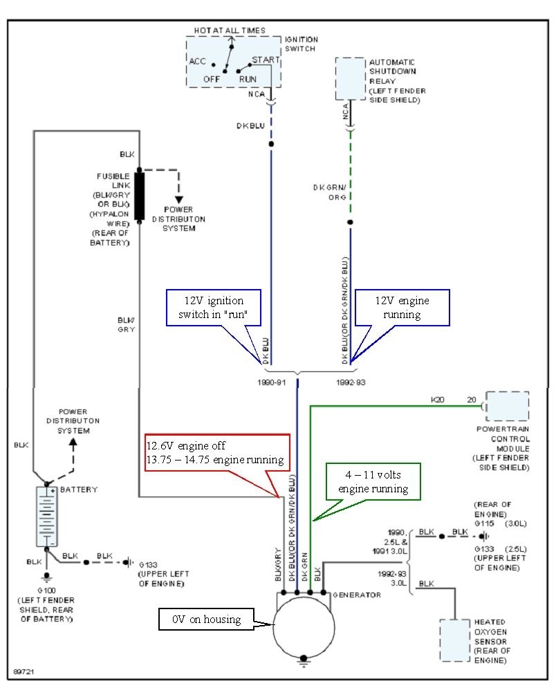 This is one rare time when there can be a ground problem. This alternator is mounted on rubber bushings to isolate it from engine vibration. There's a fat ground wire or a braided ground strap that often gets overlooked when working with the front engine mount's bolt. The strap has also been known to corrode apart.