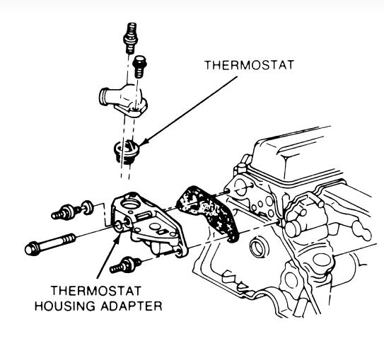 8. Place the thermostat, with the power element down, in housing, then install the water outlet while the sealer is still wet. Tighten the housing retaining bolts to 6 ft. Lbs. (8 Nm).